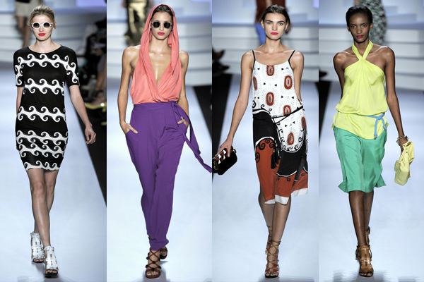 Diane von Furstenberg делает ставку на контрастные геометрические принты и чистые цвета. Современная европейская женщина, которая выбирает удобную, но эффектную одежду. Она надевает мужские брюки и свободную рубашку, но не забывает о красной помаде и глубоком вырезе на груди.